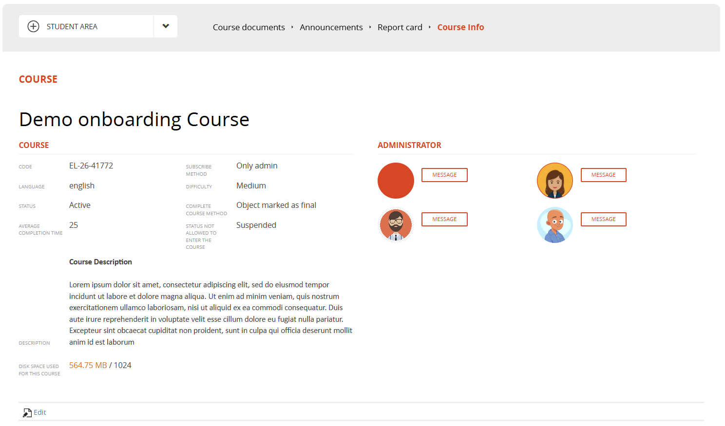 Users with edit permissions on the menu item will see the "EDIT" button and will be able to change some of the general course settings: