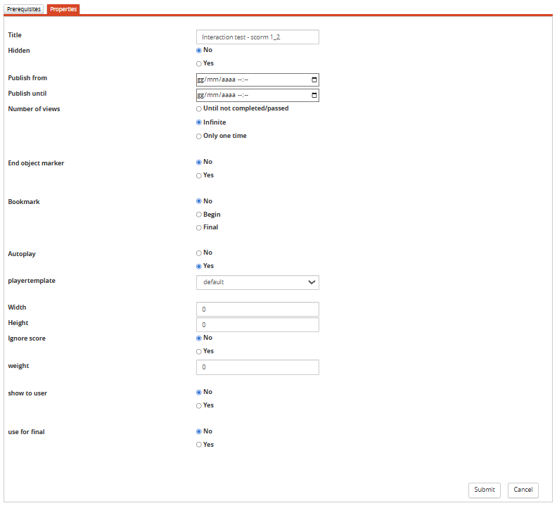 - Ignore score: only managed for SCORM objects. Essentially, if a SCORM package has a minimum score defined in its manifest but the instructor wants to set a new threshold, this flag bypasses the value declared in the manifest."