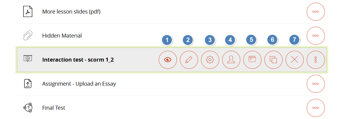 - Edit: access the edit page for this of learning object. Each type of learning object has a different edit mode.