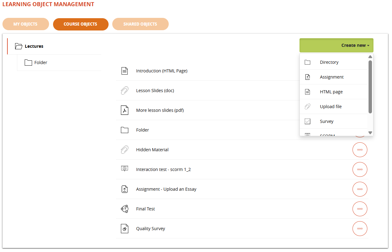 - Course Objects: list of actual LO of the course, available for students. They can be directly created from this area or imported either from MyObjects or Shared Objects areas.