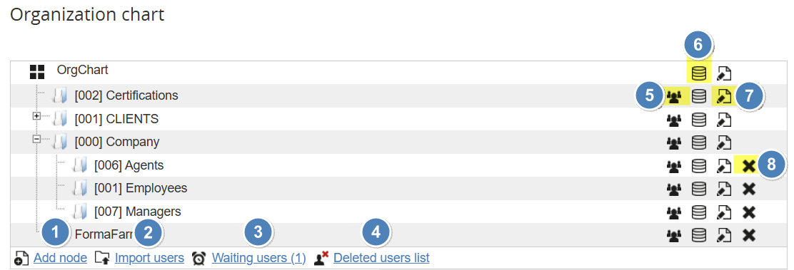 - Organization Chart: this tree-like structure of folders (nodes) represents the core logic for user's organization, and will be used by most of the other features of the LMS. To simplify user's selection and automate massive operations.