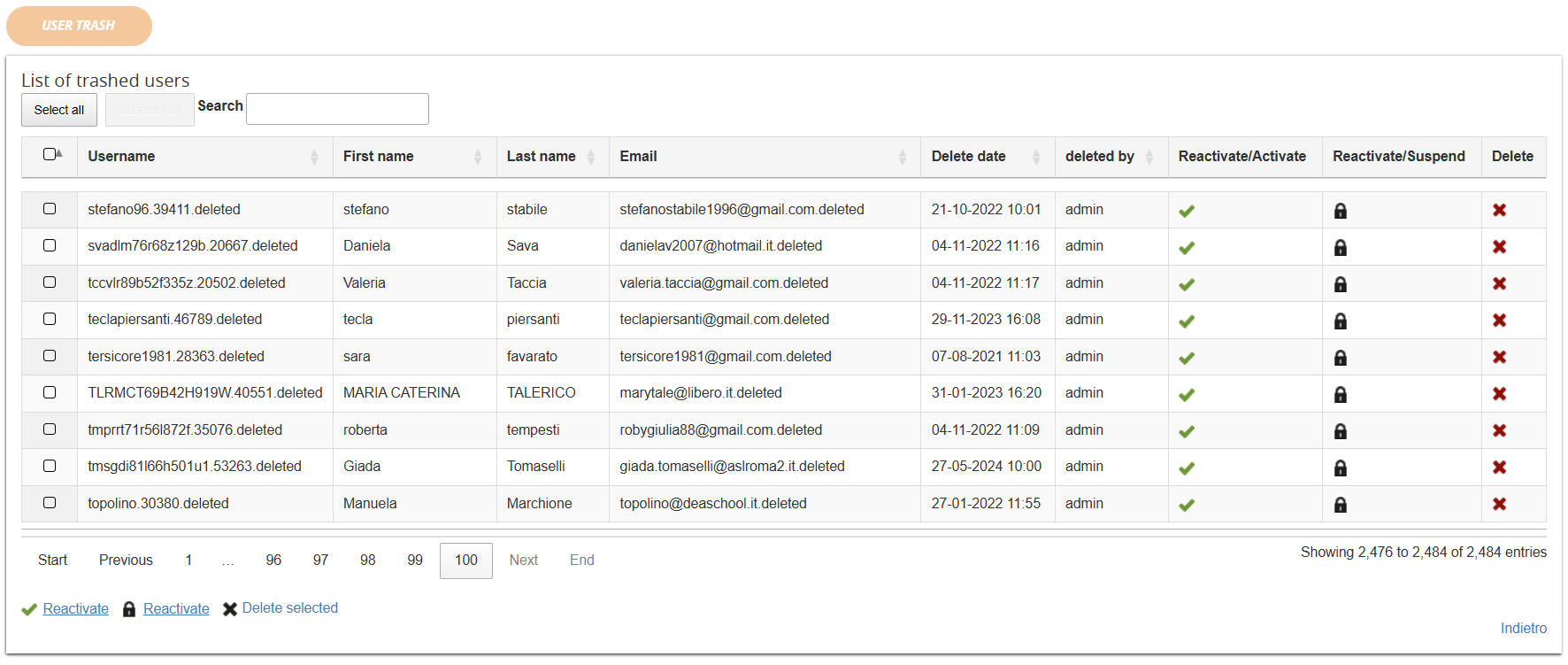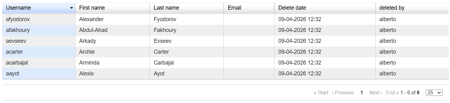 If you are upgrading from a Forma version prior to 4.2 and the deleted user list was active, all the deleted users will be reported in the new "trash" area adding a ".deleted" suffix to the username, and it will be then possible to completely remove them from the database